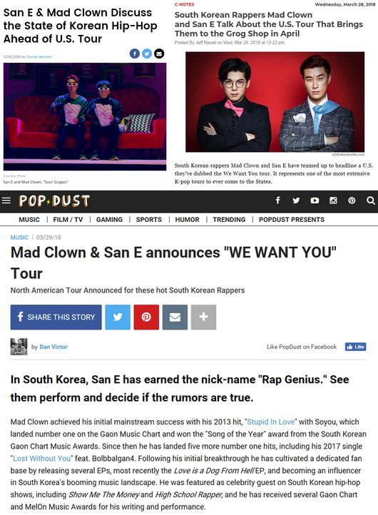 해외 팝 음악 언론 사이트인 '팝더스트'(Popdust) 역시 매드클라운과 산이, 그리고 이들의 합동 미국 투어를 비중있게 소개했다.
