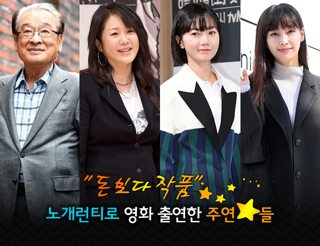 대작 영화들과 비교해 저예산이 들어간 작은 영화들은 사실 개봉이 어렵기도 하다. 이에 출연 배우들은 자신의 출연료보다 작품성을 선택하기도 한다. 개런티를 작품의 완성도에 양보하고 좋은 영화 완성에 힘을 보태고 있는 것이다. 충무로에서 ‘ 노개런티’ 출연으로 화제가 된 배우들을 모아봤다.