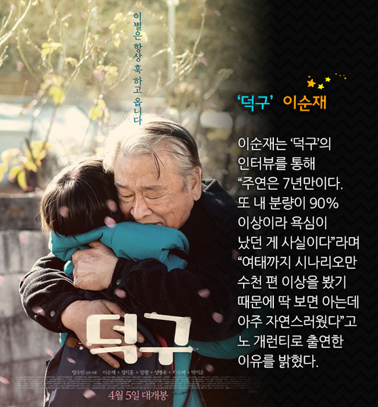 올해 나이 84세, 연기 경력 62년 동안 한 해도 쉬지 않고 현역배우로서 왕성한 활동을 보여주고 있는 배우 이순재. 그가 7년 만에 주연작 ‘덕구’로 돌아와 전 국민의 마음에 뜨거운 감동을 선사하고 있다.