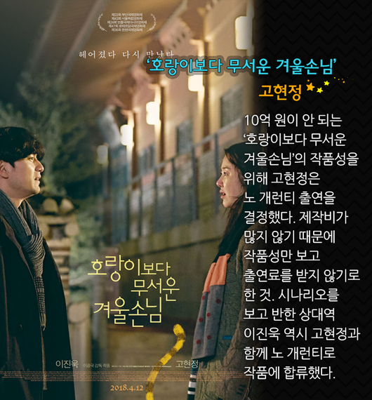 10억 원이 안 되는 ‘호랑이보다 무서운 겨울손님’의 작품성을 위해 고현정은 노 개런티 출연을 결정했다. 제작비가 많지 않기 때문에 작품성만 보고 출연료를 받지 않기로 한 것. 시나리오를 보고 반한 상대역 이진욱 역시 고현정과 함께 노 개런티로 작품에 합류했다.