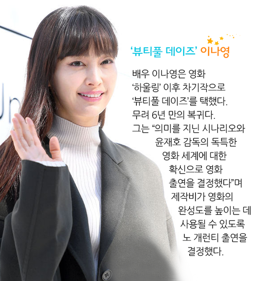 배우 이나영은 영화 ‘하울링’ 이후 차기작으로 ‘뷰티풀 데이즈’를 택했다. 무려 6년 만의 복귀다. 각종 해외 영화제에서 주목받은 윤재호 감독의 연출작이다.