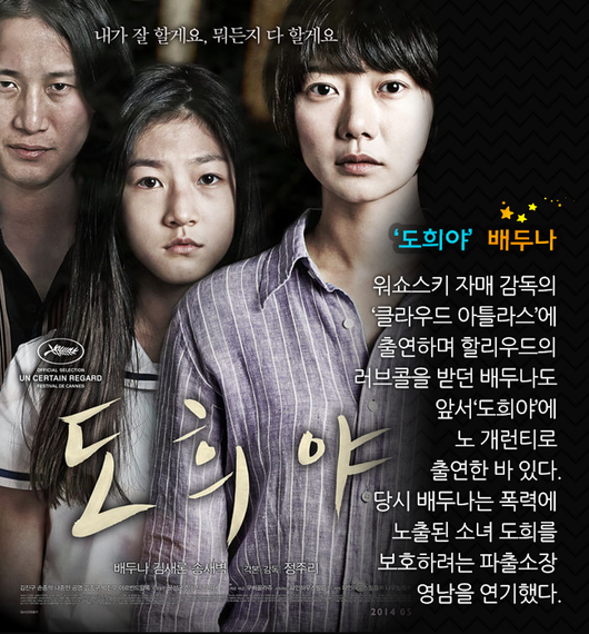 워쇼스키 자매 감독의 ‘클라우드 아틀라스’에 출연하며 할리우드의 러브콜을 받던 배두나도 앞서 ‘도희야’에 노 개런티로 출연한 바 있다. 당시 배두나는 폭력에 노출된 소녀 도희를 보호하려는 파출소장 영남을 연기했다.