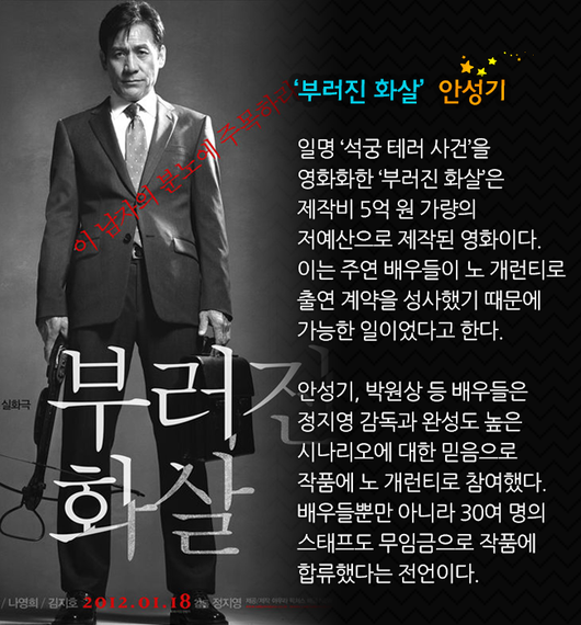 일명 ‘석궁 테러 사건’을 영화화한 ‘부러진 화살’은 제작비 5억 원 가량의 저예산으로 제작된 영화이다. 이는 주연 배우들이 노 개런티로 출연 계약을 성사했기 때문에 가능한 일이었다고 한다.