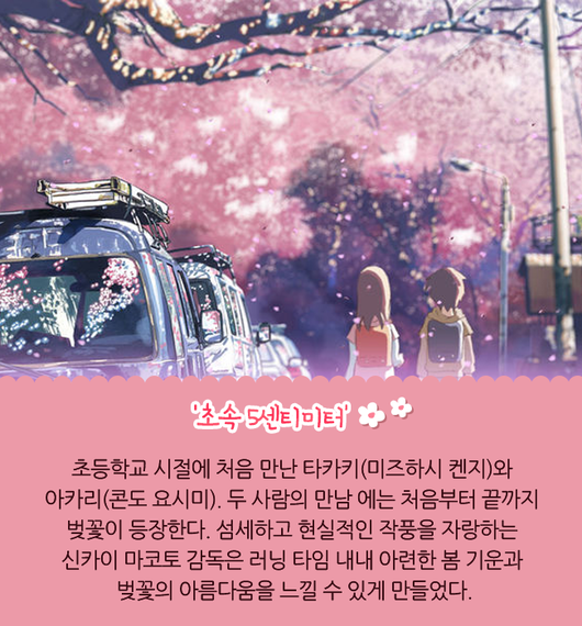 봄날을 배경으로 한 국내외 영화 및 애니메이션에서 볼 수 있는 흔한 풍경 중 하나가 바로 벚꽃이 흐드러지게 핀 모습이다. 바람이 불면 살랑살랑 떨어지는 벚꽃 잎도 빼놓을 수 없는 장면이다. 이에 벚꽃이 만개한 모습을 아름답게 표현한 다섯 작품들을 짚어봤다.