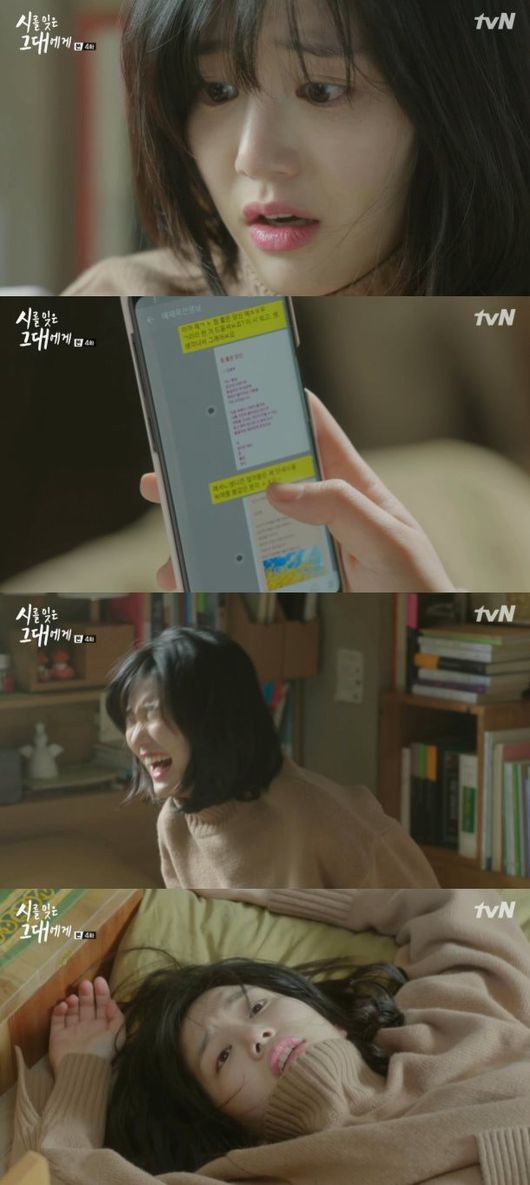 3일 방송된 tvN 월화드라마 '시를 잊은 그대에게'(극본 명수현 백선우 최보림/ 연출 한상재) 4회에서는 술에 취해 예재욱(이준혁 분)에게 보낸 문자를 보고 괴로워하는 우보영(이유비 분)의 모습이 그려졌다.