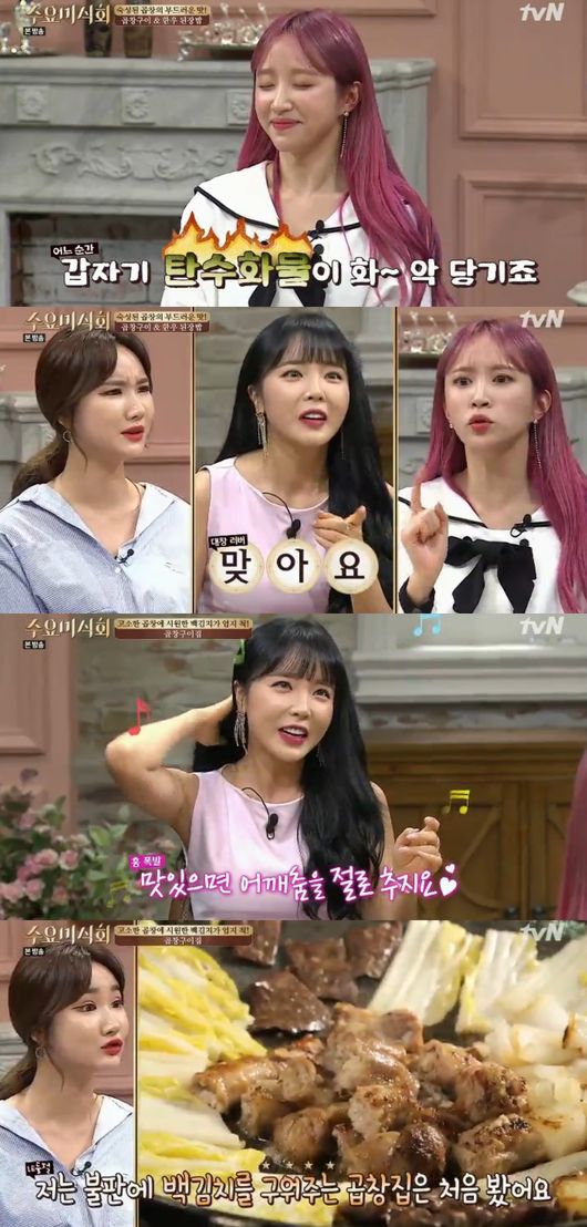 계속해서 곱창의 매력 포인트에 대해 EXID와 홍진영은 "꽉 차 있는 곱이다, 잘리는 순간 곱이 없으면 실망스럽다"면서 "곱창은 곱때문에 먹는 것"이라며 입을 모았다.