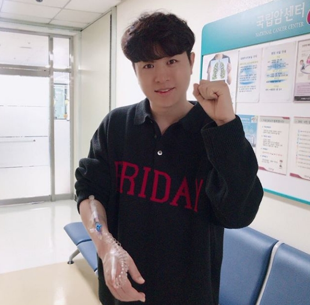 사진 속 유상무는 첫 검진에서도 밝은 표정을 잃지 않고 카메라를 응시하며 파이팅 포즈를 취하고 있다. 검진으로 인해 오른팔에 꽂혀진 주사기가 눈에 띈다.