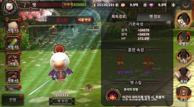 유저가 보유한 펫은 공격과 방어, HP 세 가지의 기본적인 능력치 외에도 펫 훈련 및 강화 시스템을 통해 공격과 방어, HP 능력치 상승효과는 물론 일반 대미지와 궁극기 대미지 등 최대 8가지의 새로운 추가 훈련 속성 능력치를 획득할 수 있다.