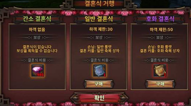 게임 내에서의 결혼식은 약 30분간 진행되며, 대상자들이 결혼식장 내부에 진입하면 결혼식 복장의 코스튬으로 변경된다. 초대를 받은 친구와 길드원들은 폭죽을 소환해 결혼하는 커플을 축하할 수 있으며, 소환된 폭죽의 수에 따라 결혼식장 내부에 있는 룰렛을 사용해 보상을 획득할 수 있다. 해당 결혼식의 주인공 2명은 폭죽이 소환된 누적 횟수에 따라 고급 보상을 추가로 획득할 수 있다.