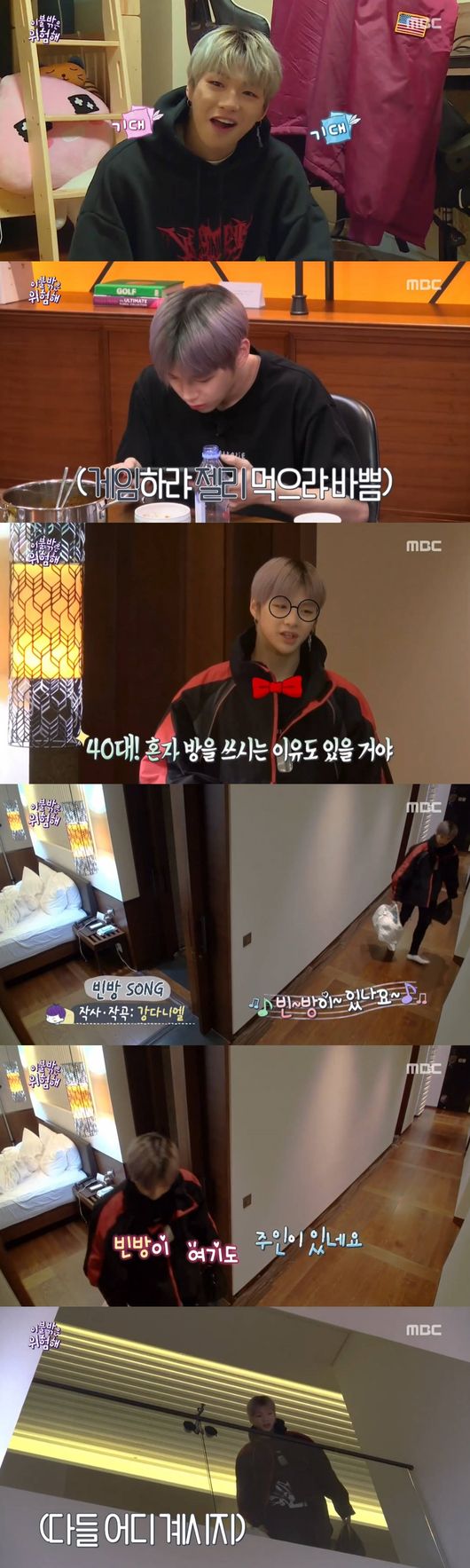 스케줄을 마치고 늦은 시간 등장한 강다니엘은 모두가 숙소를 비운 상황에서 홀로 '집돌이' 면모를 보여줬다. 아무도 없는 숙소에서 '빈방송'을 즉석에서 부르고, 소지품을 보고 출연자가 누구일지 추측하기도.