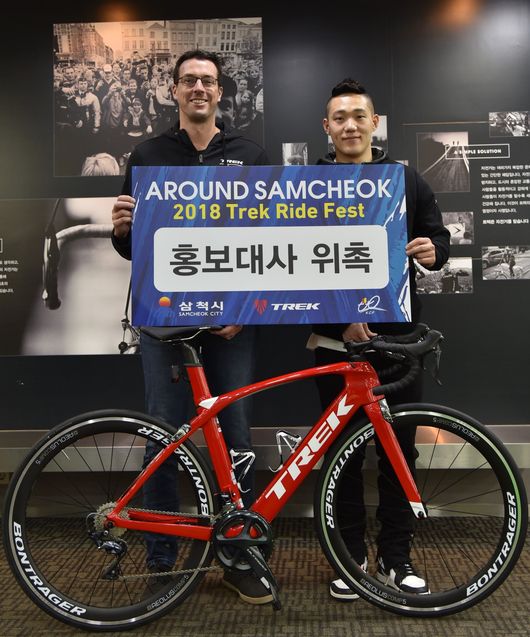강원도 삼척시와 트렉바이시클코리아는 6일 서울 서초구 양재동 트렉바이시클코리아 본사에서 모태범을 ‘어라운드 삼척 2018 트렉 라이드 페스트(AROUND SAMCHEOK 2018 TREK RIDE FEST)’ 공식 홍보대사로 위촉하며 기념사진 촬영을 진행했다.