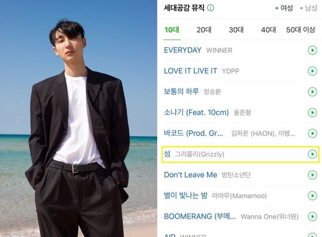 10대 여성 많이 들은 음악에 5일 발매된 그리즐리(Grizzly)의 신곡‘섬’이 10대 여성이 가장 많이 들은 음악에 선정됐다.