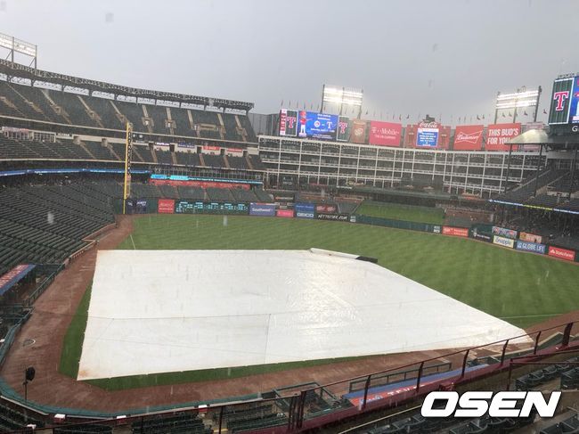 예정된 경기 시작을 30분 앞두고 텍사스 알링턴 지역에 갑작스러운 폭우가 내렸다. 보슬비로 시작된 비는 빗방울이 갑자기 굵어져 폭우로 바뀌었다. 관중들도 폭우를 피해 지붕 밑으로 대피했다. 구단에서는 방수포를 깔았다. 약 20분 뒤 비가 그쳤지만 경기는 40분 늦은 한국시간 오전 9시 40분으로 개시가 미뤄졌다.