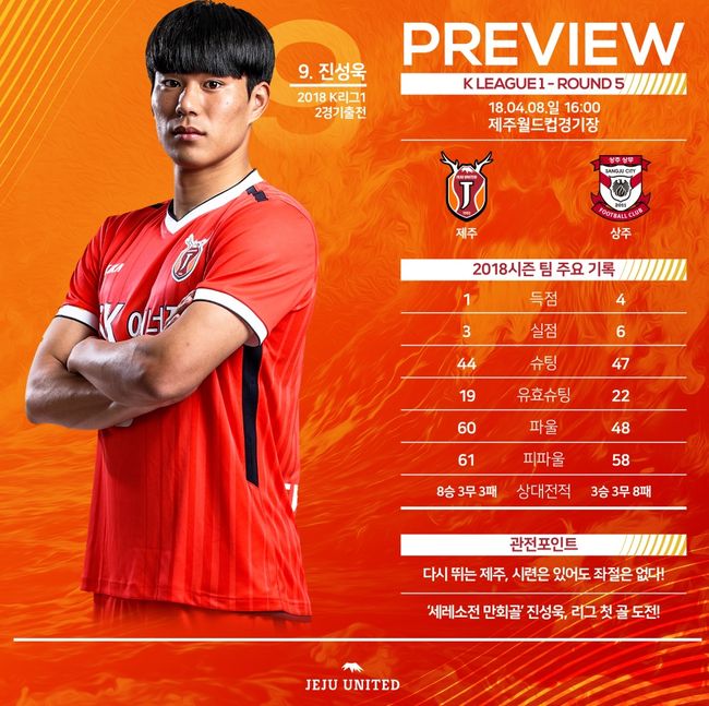 제주는 8일 오후 4시 제주월드컵경기장에서 열리는 KEB하나은행 K리그1 5라운드 홈 경기에서 상주와 격돌한다. 현재 제주는 1승 1무 2패 승점 4로 8위에 머물러 있다.