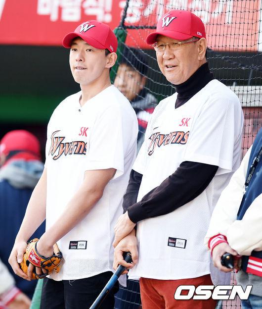 박기원 대한항공 감독과 팀의 주전 세터 한선수는 7일 인천SK행복드림구장에서 열린 삼성과의 경기를 앞서 시구·시타 행사를 가졌다. 이번 행사는 같은 인천을 연고로 쓰는 SK와 대한항공의 협력 속에 성사됐다. SK가 먼저 시구·시타 행사 초대장을 보냈고, 대한항공이 흔쾌히 수락하면서 이날 우승의 두 주역이 야구장을 찾았다.