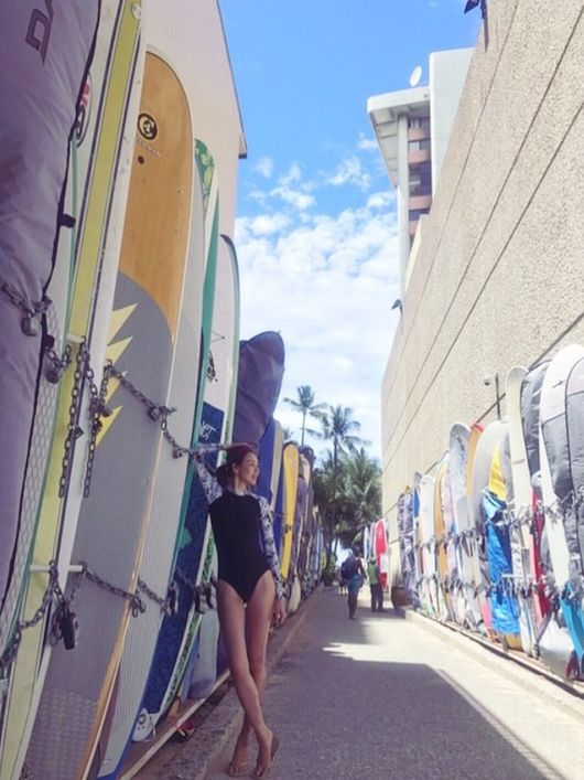 공개된 사진 속에서 야노 시호는 푸른 하와이의 하늘과 서핑 보드가 세워진 하와이의 골목을 배경으로 포즈를 취하고 있는 모습. 래시 가드를 입고 쭉 뻗은 다리로 감각적인 포즈를 취하고 있는 야노 시호의 모습이 시선을 사로잡는다. 야노 시호는 군살이라고는 찾아볼 수 없는 완벽한 각선미로 모델다운 극강의 S라인을 뽐냈다.