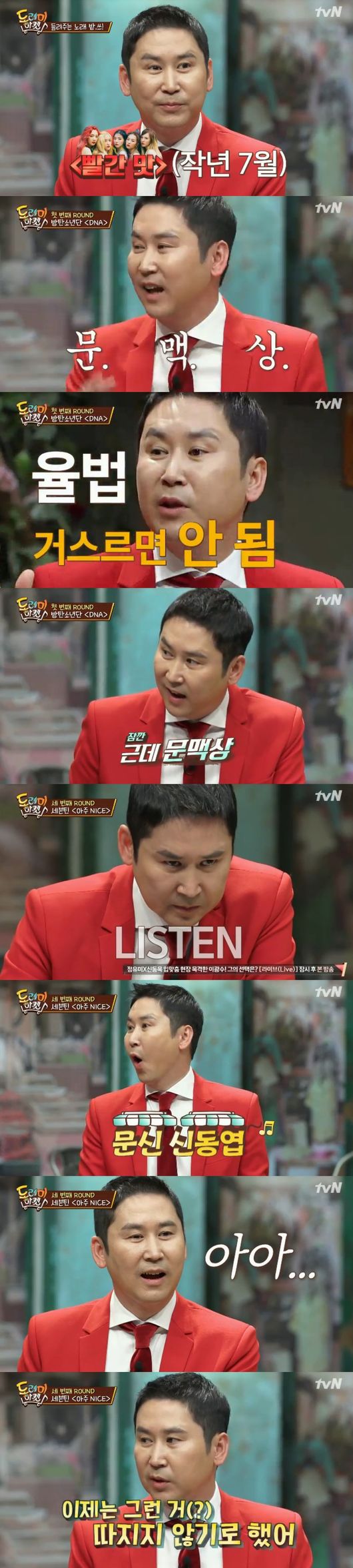 그럼에도 신동엽은 절대음감에 대해 자신만만, 하지만 이내 첫번째 문제 앞에서 "전혀 안 들린다"며 약한 모습을 보였다. 이때, 옆에서 신동엽의 답을 훔쳐 본 박나래는 "시를 쓰셨다"면서 사자성어가 된 소름돋는 진양조 장단 가사에 기겁했다. 여운을 남기는 가사였지만 흐름이 끊겼던 것.