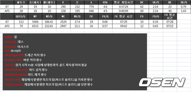 정규시즌 성적은 13승 5패로 백중세. 2위 아프리카가 득실에서 +2로 앞선다. 지표에서도 막상막하다. 공격적인 운용을 추구하는 KT는 퍼스트킬이나 초반 라인전의 비중을 두는 편이었고, 실수 없는 운영을 추구하는 아프리카는 바론 사냥이나 시야 장악에서 우위를 점했다.