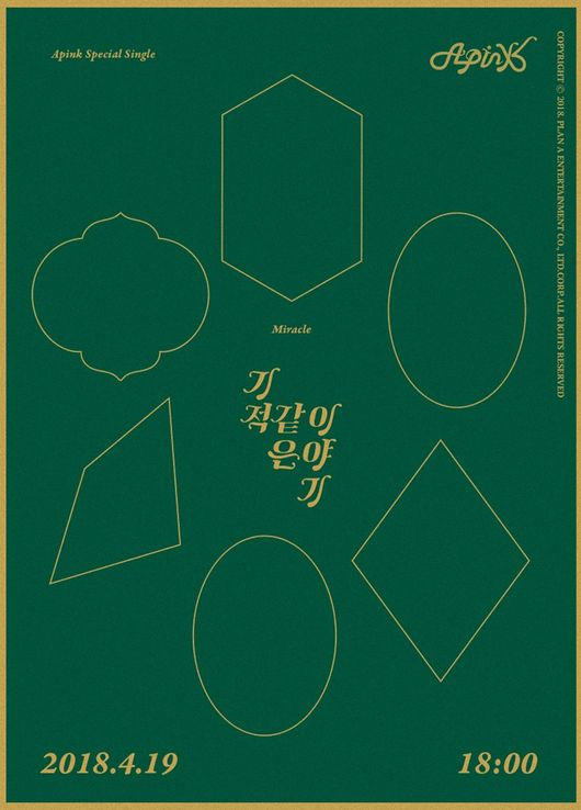 'Apink Special Single '기적 같은 이야기' 2018.04.19 18:00'라는 문구와 함께 공개된 이미지에는 녹색 배경을 바탕으로 에이핑크의 멤버 수와 동일한 6가지의 도형이 그려져 있어 의문을 자아낸다.