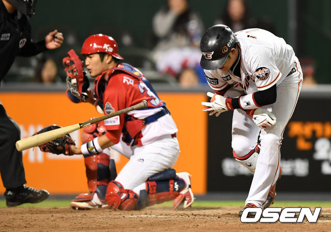 타석에는 이성열. 초구부터 볼을 던지며 제구가 흔들린 임기준은 2구째 직구가 손에서 빠져 이성열의 오른쪽 종아리를 맞혔다. 몸에 맞는 볼로 무사 만루 위기를 자초했다.