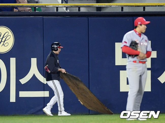 3회말 경기 도중에는 백스크린 쪽에서 커다란 판자가 외야 그라운드로 날아 들어왔다. 경기운영요원이 혼자서 들지 못할 정도로 컸다. 땅에 질질 끌면서 수거했다. 때마침 SK가 비디오판독을 요청해서 경기가 잠시 중단된 상황이어서 다행이었다.