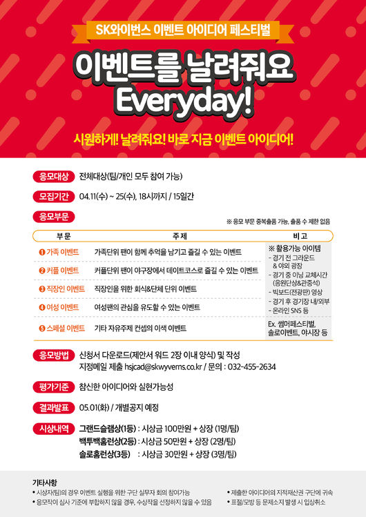 SK와이번스(대표이사 류준열)가 이벤트 아이디어 페스티벌 ‘이벤트를 날려줘요 Everyday!’ 공모전을 실시한다.