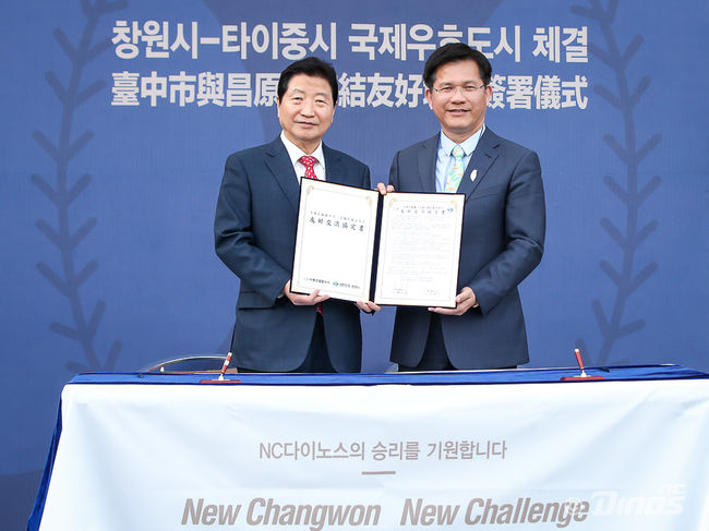 창원시는 대만 타이중시와 국제우호도시 협약을 맺었다. 안상수 창원시장, 린쟈롱 타이중시장이 11일 창원 마산야구장에서 협약식을 열었다. 타이중은 인구 274만명에 이르는 대만 제3의 도시로, 왕웨이중 선수가 대학을 다닌 곳이기도 하다. kt 위즈와의 홈경기에 앞서 타이중시 마스코트 석호와 NC 마스코트 단디, 쎄리가 나란히 축하공연을 펼쳤다. 안상수 시장과 린쟈롱 시장이 공동 시구로 두 도시의 우정을 다졌다. 린쟈롱 타이중시장은 "오늘 왕웨이중 선수가 멋지게 승리하길 바란다. 아울러 많은 한국팬이 2018년 타이중세계화훼박람회에 방문해주시길 요청드리며 양시의 우정이 영원하길 기원한다"고 말했다.