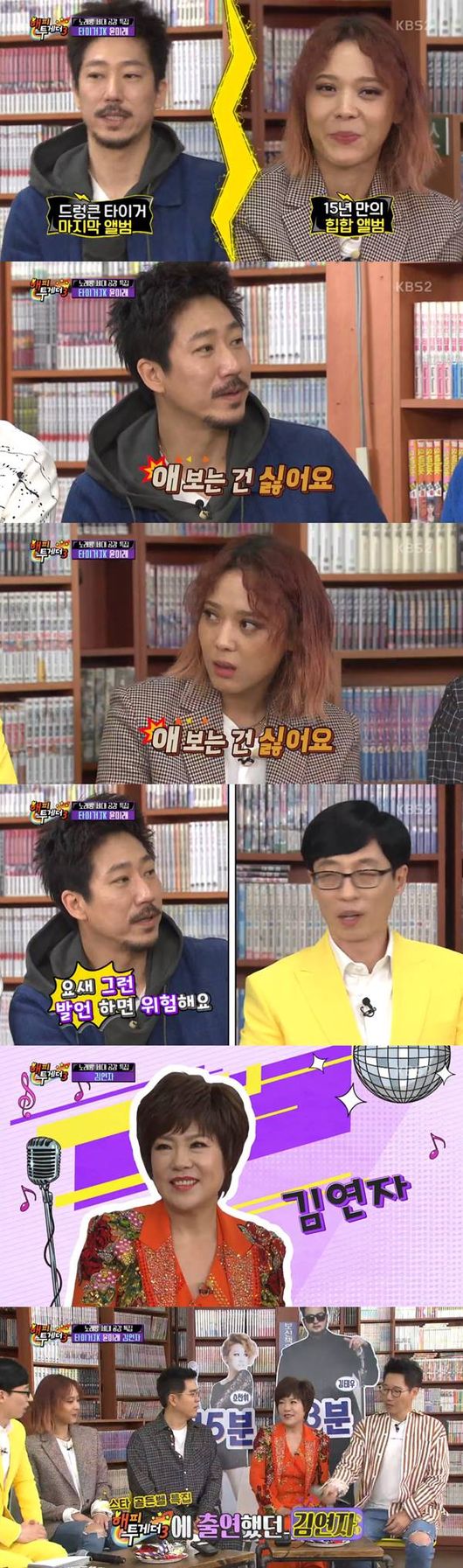 12일 오후 방송된 KBS 2TV 예능프로그램 '해피투게더3'의 '내 노래를 불러줘' 코너에는 타이거JK와 윤미래, 김연자가 출연했다. 솔직한 입담을 자랑하면 색다른 조합으로 웃음을 줬다.