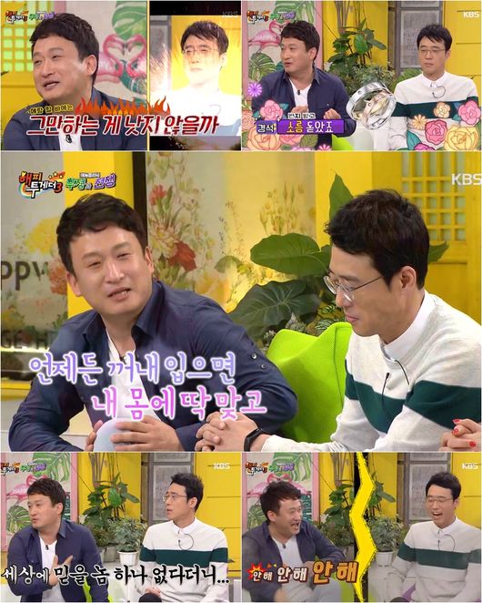 시청자들의 든든한 사랑을 받고 있는 목요일 밤의 터줏대감 KBS 2TV ′해피투게더3′(이하 ‘해투3’)의 12일 방송은 박수홍-윤정수, 서경석-이윤석이 출연한 ‘해투동:예능클리닉-우정과 전쟁’과 타이거JK-윤미래-김연자-한동근이 출연한 ‘내 노래를 불러줘:노래방 세대공감 1탄’으로 꾸며졌다. 이 가운데 ‘예능클리닉-우정과 전쟁’에서는 ‘브로맨스 시조새’ 서경석-이윤석 콤비가 썸과 쌈을 오가는 알콩달콩한 우정 토크로 믿고 보는 ‘개그콤비’라는 사실을 재 확인시켰다.