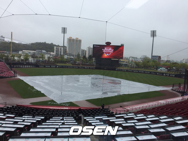 이날 광주지역은 새벽부터 많은 비가 내렸고 오후까지 이어졌다. 오후 2시 전후로 비가 잦아들었지만 다시 굵어졌다. KIA 구단은 대형 방수포를 깔아 대비를 했다. 오후 3시에는 가랑비가 계속 내렸다.