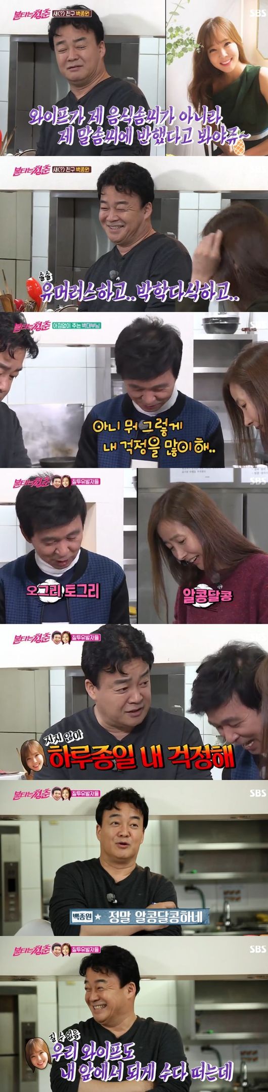 이에 김국진은 "하루에 반은 내 걱정을 한다"고 자랑했고, 이에 백종원도 질세라 "우리 아내는 하루종일 내 걱정이다. 지금도 아마 내 걱정하고 있을 것"이라고 받아쳤다.