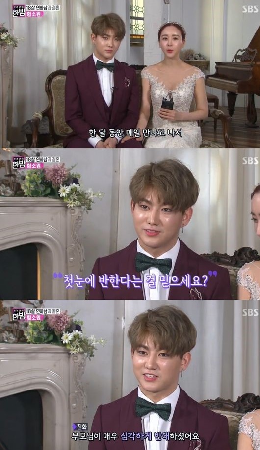 또한, 함소원♥진화는 부모님의 반대도 극복해야 했다. SBS '본격 연애 한밤'에 출연한 진화는 "18살 차이가 난다는 것은 나중에 알았다. 처음에는 아내를 27~28살 정도로 봤다. 하지만 알았을 땐 이미 마음이 시작되고 있었다. 사실 부모님의 반대가 심하셨다. 아버지가 부자 관계를 끊자고 하셨는데, 반대해도 결혼하겠다고 말했었다. 지금은 허락하셨다"고 털어놨다.