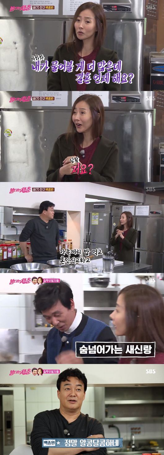 지난 17일 오후 방송된 SBS '불타는 청춘'에서는 백종원이 출연해서 강수지와 김국진을 만났다. 김국진의 요리선생님으로 무지개떡 비법을 전수하기 위한 것이었다.