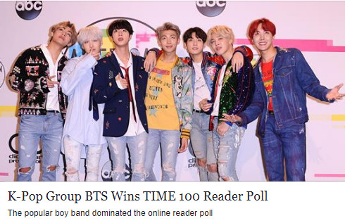 미국 '타임지'는 최근 홈페이지를 통해 '2018 타임 100 리더' 설문조사를 실시했고 17일(현지 시각) 최종 결과를 발표했다. 여기에서 방탄소년단이 15%의 지지를 받아 1위에 올랐다.