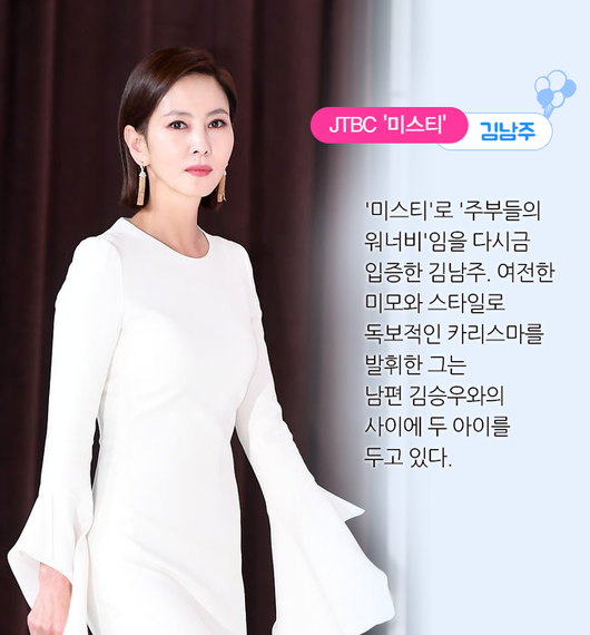 '미스티'로 '주부들의 워너비'임을 다시금 입증한 김남주. 여전한 미모와 스타일로 독보적인 카리스마를 발휘한 그는 남편 김승우와의 사이에 두 아이를 두고 있다.