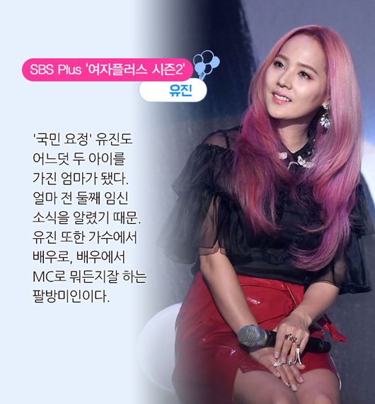 '국민 요정' 유진도 어느덧 두 아이를 가진 엄마가 됐다. 얼마 전 둘째 임신 소식을 알렸기 때문. 유진 또한 가수에서 배우로, 배우에서 MC로 뭐든지 잘 하는 팔방미인이다.