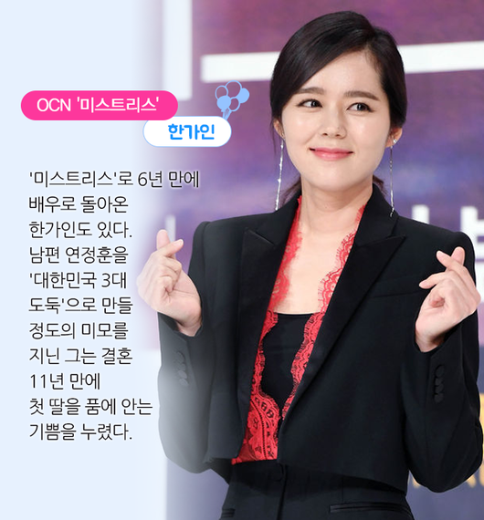 '미스트리스'로 6년 만에 배우로 돌아온 한가인도 있다. 남편 연정훈을 '대한민국 3대 도둑'으로 만들 정도의 미모를 지닌 그는 결혼 11년 만에 첫 딸을 품에 안는 기쁨을 누렸다.