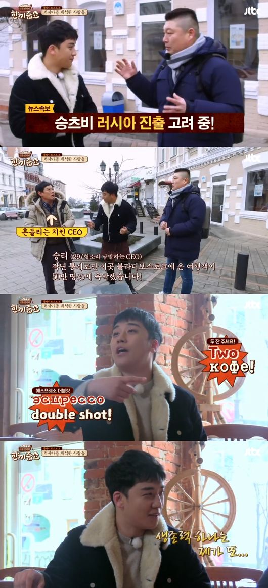 30분 만에 속성으로 배웠다는 러시아어를 유창하게 구사하며 모두를 놀라게 한 승리는 "앞으로 러시아 시장이 엄청날 것이라는 소리를 듣고 시장 조사를 하러 왔다"고 말했다. 승리는 "작년 통계로만 블라디보스토크에 50만 명의 여행객이 왔다고 하더라. 앞으로 100만 명, 150만 명을 바라보고 있기 때문에 이곳에서 어떤 것을 할 수 있을지 고민 중이다"라며 '승츠비'의 면모를 뽐냈다.
