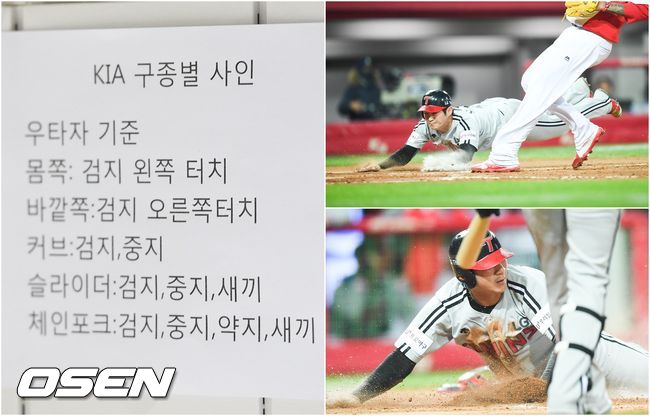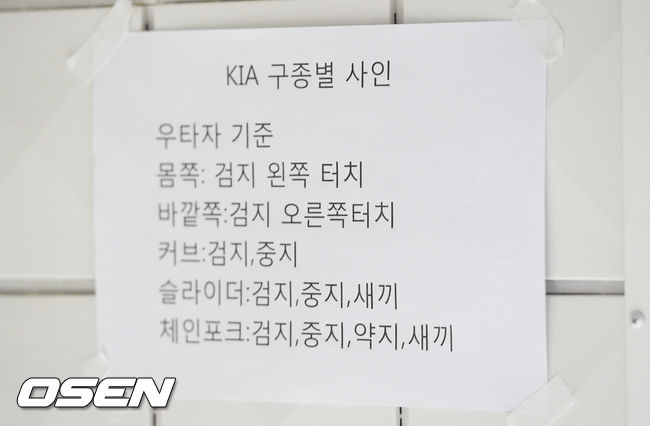 LG는 18일 광주-기아 챔피언스필드에서 열린 KIA전에 앞서 'KIA 구종별 사인'이라는 A4 용지를 더그아웃 옆 통로 벽에다 붙여 놨다. 우타자 기준으로 몸쪽, 바깥쪽, 커브, 슬라이더, 체인지업(포크) 등에 대한 손가락 사인 암호를 적어놨다.