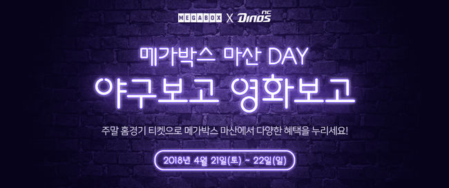 NC 다이노스가 이번주 토일 창원 마산야구장에서 '메가박스 마산 DAY, 야구보고 영화보고' 행사를 연다. 오는 21~22일 LG와의 홈경기 기간이다. 야구장에 오는 모든 팬에게 기회가 생긴다.