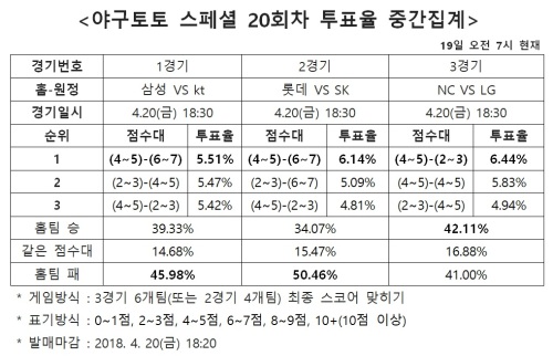 KBO 3경기 대상 야구토토 스페셜 20회차 투표율 중간집계