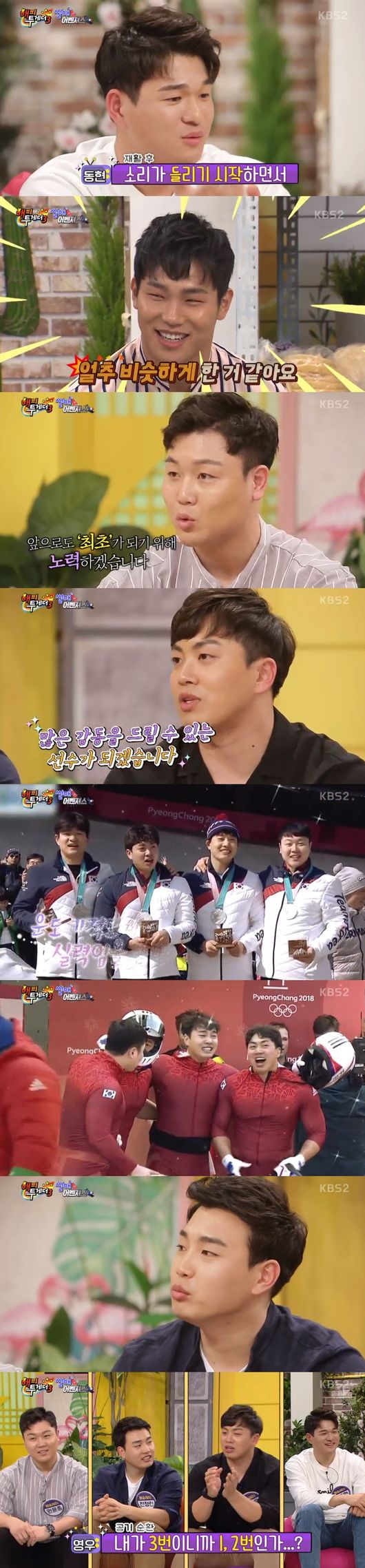 19일 방송된 KBS 2TV '해피투게더3'에서는 '썰매 어벤저스' 특집으로 '평창의 썰매영웅' 스켈레톤 윤성빈, 봅슬레이 원윤종-김동현-전정린-서영우가 출연했다.