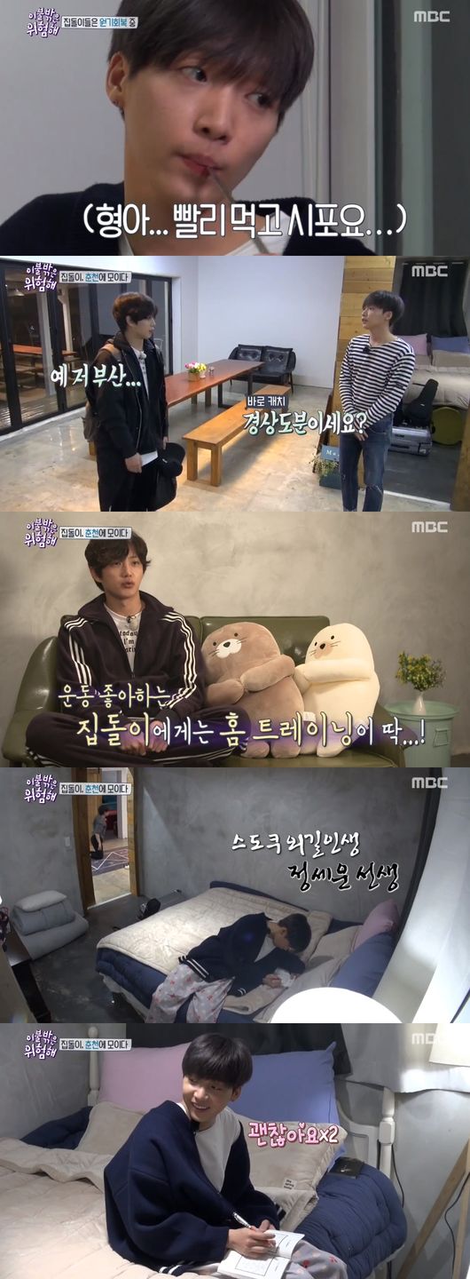 같은 집돌이지만 전혀 다른 생활 패턴을 자랑한 정세운과 김민석이었다. 김민석은 "최근에 영화를 찍느라 몸을 관리하다"며 홈 트레이닝에 열중했다. 그러나 열정만큼 따라주지 않는 몸 상태에 신음을 연발했다. 김민석은 물구나무서기에 이어 쩍벌자세까지 다양한 홈 트레이닝에 매진하며 연신 신음 소리를 냈다.
