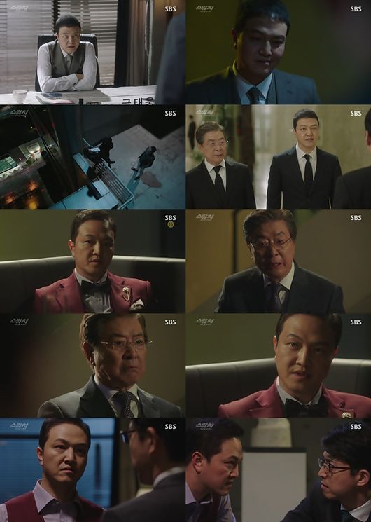 이날 방송에서는 금태웅(정웅인)이 스스로 최정필(이정길)이 운영하는 사조직 ‘남산클럽’의 새로운 리더로 등극, 최정필을 강제로 물러나게 만드는 모습이 담겼다. 마약밀수로 비자금 형성이 어려워진 최정필은 러시아에서 온 빅토르장에게 비밀리에 투자 할 계획을 세운 후 자신의 사금고인 케이저축은행장에게 비자금 천억을 만들라고 지시했던 상황. 이를 알게 된 금태웅은 저축은행장을 찾아갔고, 이후 은행장은 옥상에서 떨어져 숨을 거뒀다. 자신의 비자금을 만들다 갑자기 숨진 저축은행장이 도박 빚으로 자살했다는 부고에 석연치 않아하던 최정필은 은행장의 장례식장에서 백준수로 온 사도찬(장근석)을 만났다. 사도찬은 최정필에게 은행장이 도박을 즐겨하지 않았다며 은행장의 죽음으로 누가 이득을 보는지 생각해보라는 의미심장한 말을 던졌고, 이에 은행장을 금태웅이 살해했다고 확신한 최정필은 금태웅을 제외하고자 ‘남산클럽’을 소집했다.