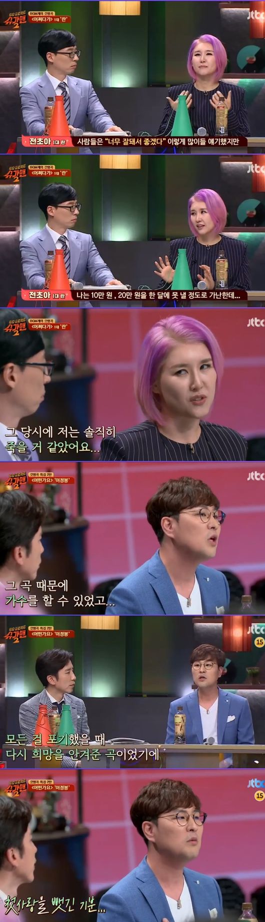 란과 이정봉이 '슈가맨2'에 소환됐다. 두 사람은 한 시대를 풍미했던 '어쩌다가' '어떤가요'를 다시 부르며 그때의 감동을 선사했다. 이정봉은 "이 노래는 나에게 첫사랑같은 곡이었다"고 밝혔고, 란은 "애증의 노래였다"고 뒷이야기를 전했다.