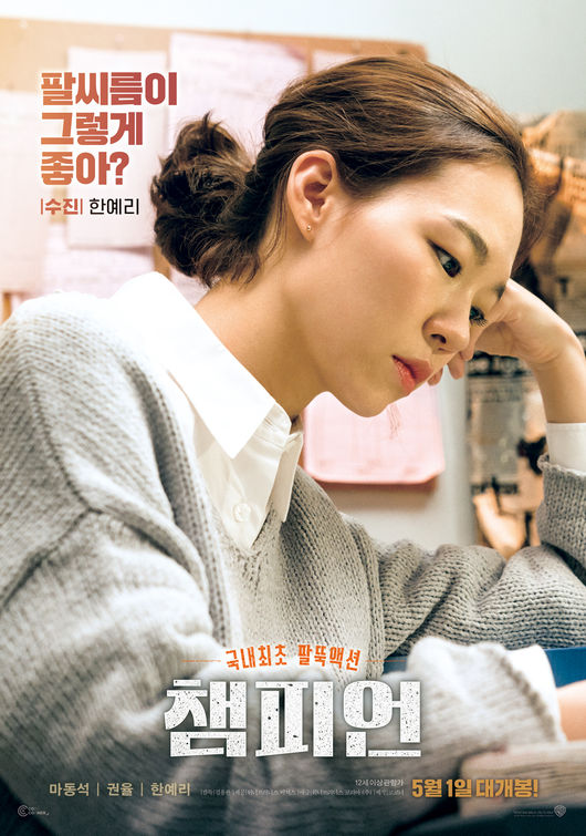 두 아이를 위해서라면 못하는 게 없는 싱글맘 ‘수진’의 포스터는 깊은 고민에 빠진 듯한 한예리의 모습으로 눈길을 끈다. 필모그래피 최초로 싱글맘 역을 맡은 한예리는 특유의 섬세한 감성연기로 따뜻한 감동을 전할 예정. 포스터 속 “팔씨름이 그렇게 좋아?”라는 카피는 ‘마크’의 도전을 지지하는 ‘수진’의 마음과 걱정하는 마음을 동시에 전하며 진한 가족애를 엿볼 수 있게 한다.