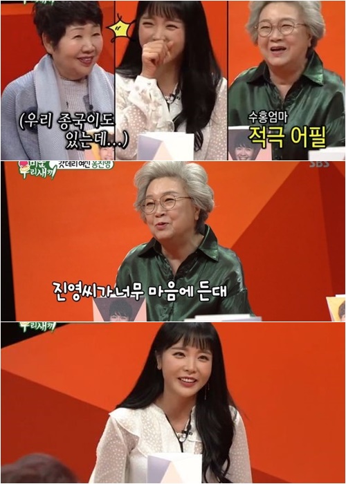 이런 홍진영의 배려심 깊고 애교 넘치는 매력은 어머니들에게도 통했다. 22일 방송된 SBS '미운 우리 새끼'에 특별 MC로 출연한 그는 모(母)벤져스에게 뜨거운 애정과 호응을 받은 것. 특히 박수홍과 김종국의 어머니는 홍진영에게 "(며느리로서) 잡고 싶다"라는 바람을 드러낸 바다.