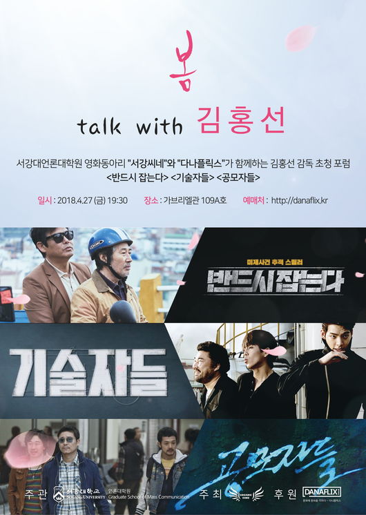 오는 27일 오후 7시30분부터 서울 마포구 서강대학교 가브리엘관 109A호에서 김홍선 감독의 토크콘서트 ‘봄, Talk with 김홍선’이 진행된다. 이번 콘서트는 서강대학교언론대학원이 주관하고 서강대학교언론대학원 영화동아리 ‘서강씨네’가 주최했다. 더불어 문화공유플랫폼 다나플릭스가 공식 후원 및 토크콘서트를 준비했다.