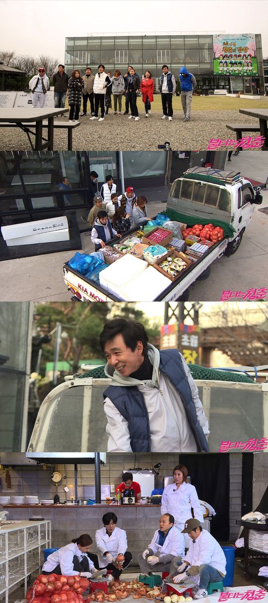 그러나 곧 이어 식재료를 가득 채운 1.5톤 트럭이 도착하자 청춘들은 어마어마한 재료의 양을 보고 충격에 빠졌다. 강수지는 “시장이 왔다”며 소리쳤고, 각 팀마다 필요한 재료를 찾던 중 흡사 시장통 같은 분위기가 형성되자 김국진은 트럭 위에 올라가 “필요한 거 있으면 말씀하라”며 즉석 콩트를 선보였다.