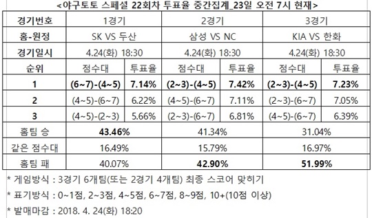 KBO 3경기 대상 야구토토 스페셜 23회차 투표율 중간집계